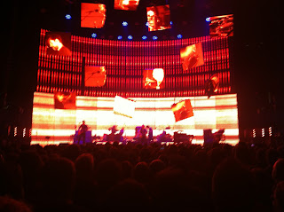 When we got to the venue, we grabbed a beer and headed for the floor. We missed the opening act but were still there early enough to establish ourselves about 20 yards from the stage and shortly the band came out around 8:45. One of the great things about a Radiohead show is the amazingly brilliant light show you get with the performance. For this tour, the band has twelve huge flat screens that are hung up by some cables and with each song they play, the screens are moved and shifted in different arrangements. There are cameras set up in strategic areas that cover not only a close up of each band member but also of the instruments they play. There are also six widescreens connected to each other at the very top of the stage that includes similar images. Behind the band is a wall of lights that dance and bounce with the beat of the music. For each song, there is also a different color scheme chosen, each one as bright and luminous as the other. Midway through the show some dude made his way up to where we were standing and was dancing like a madman, bouncing into people all around him. He soon started apologizing and admitted he was on an acid trip. I can’t imagine what that must have been like for him. It was sensory overload even for the sober.